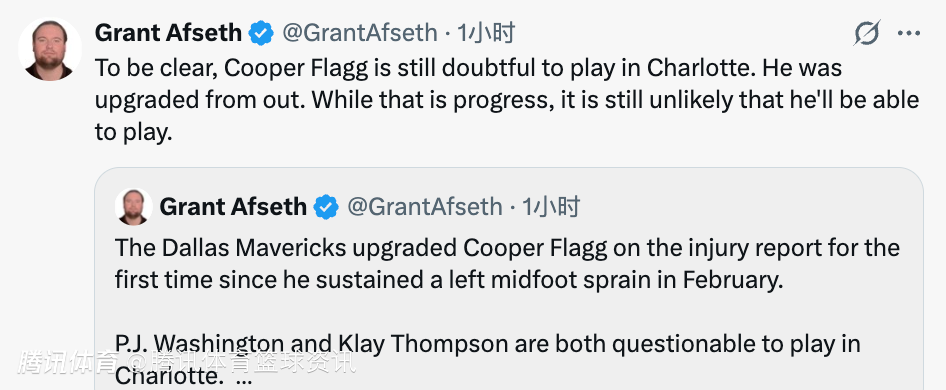 随后独行侠队记Grant Afseth跟进报道,需要说明的是,弗拉格出战黄蜂的比赛仍然是出战存疑。他的状态只是从“缺阵”上调了一级,虽然这代表恢复有进展,但他仍然不太可能登场比赛。