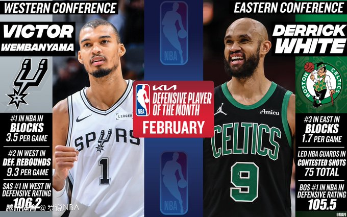 文班亚马当选2月西部月最佳防守球员,凯尔特人后卫德里克-怀特则斩获2月东部月最佳防守球员。