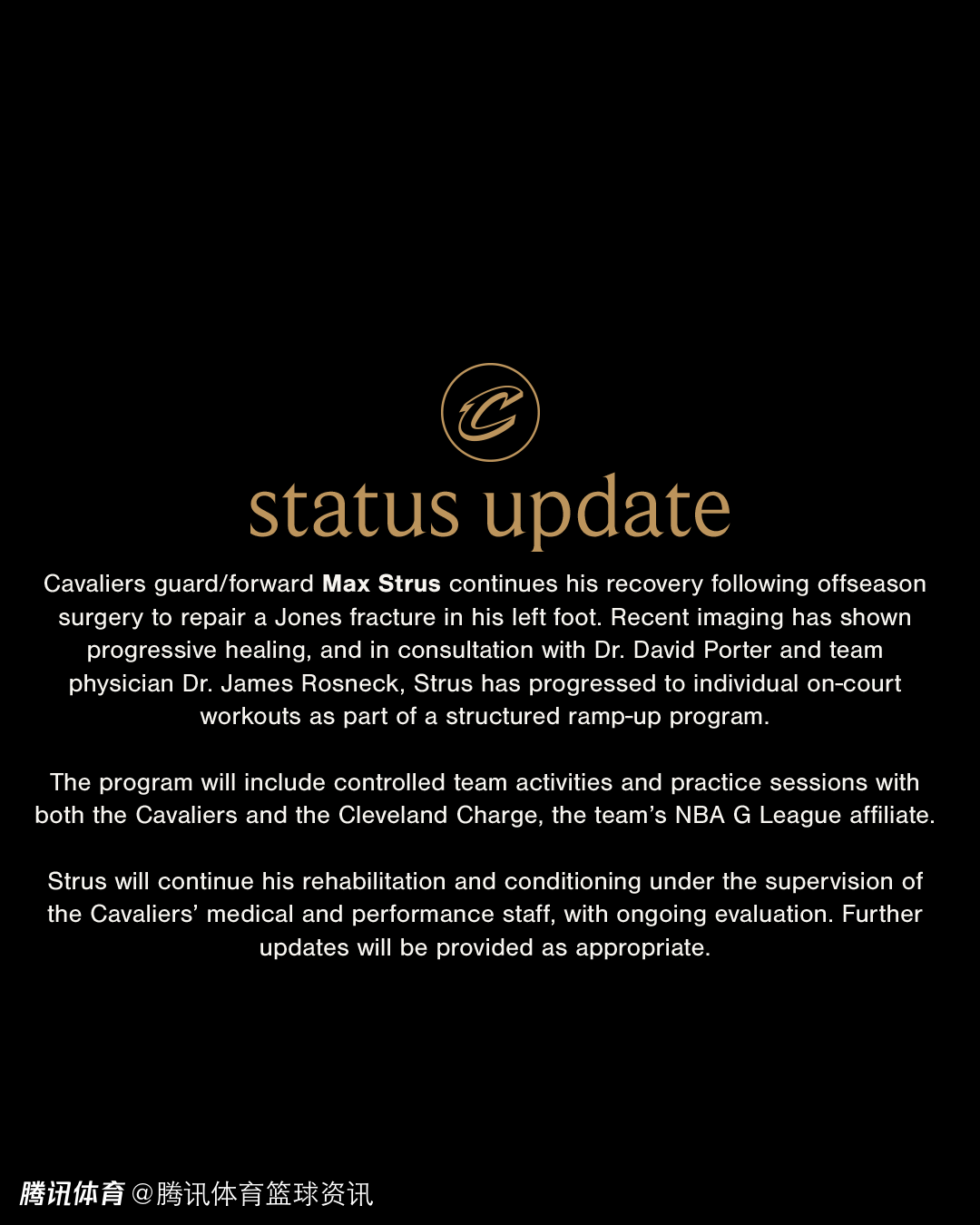 骑士队官方发文写道:“斯特鲁斯在休赛期接受左脚琼斯骨折修复手术后,目前仍在恢复中。近期检查结果显示,伤势正逐步愈合。在与大卫-波特医生及球队队医詹姆斯-罗斯内克协商后,斯特鲁斯已进入恢复计划的下一阶段,开始进行个人场上训练。