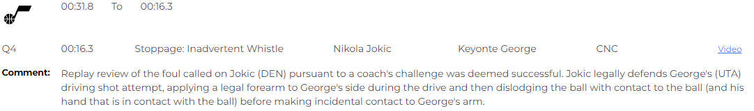 此外,在比赛结束前16.3秒,掘金队成功挑战了约基奇的防守犯规,裁判报告显示这次挑战成功无误,约基奇在防守乔治突破上篮时为合法防守,突破过程中他用前臂合理接触乔治身体侧面,随后先碰到球及持球手将球破坏,之后才偶然接触到乔治的手臂。