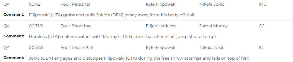 随后在终场前31.8秒,穆雷执行罚球,约基奇与菲利波夫斯基发生身体接触并将其推开,随后压在对方身上。裁判当时吹罚了菲利波夫斯基无球争抢犯规,但裁判报告显示,这个吹罚是一次错判。