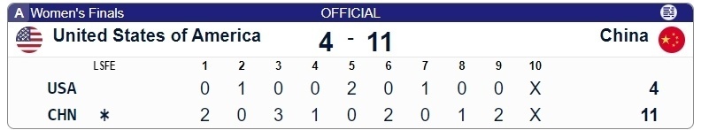 第七局:在没有偶数后手权的情况下,尽管正常下来双方各有2个后手局,但落后5分的美国还是太过被动,这局中国再度成功控分。