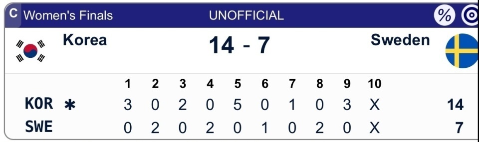 此时已经后悔不迭的瑞典,虽然从下半场加强了防守,可6分领先的韩国也是有恃无恐,将比分咬的很紧,没有给对手翻盘机会。在第九局韩国再度拿下3分之后,瑞典队面对7-14的分数,也提前一局握手认输。