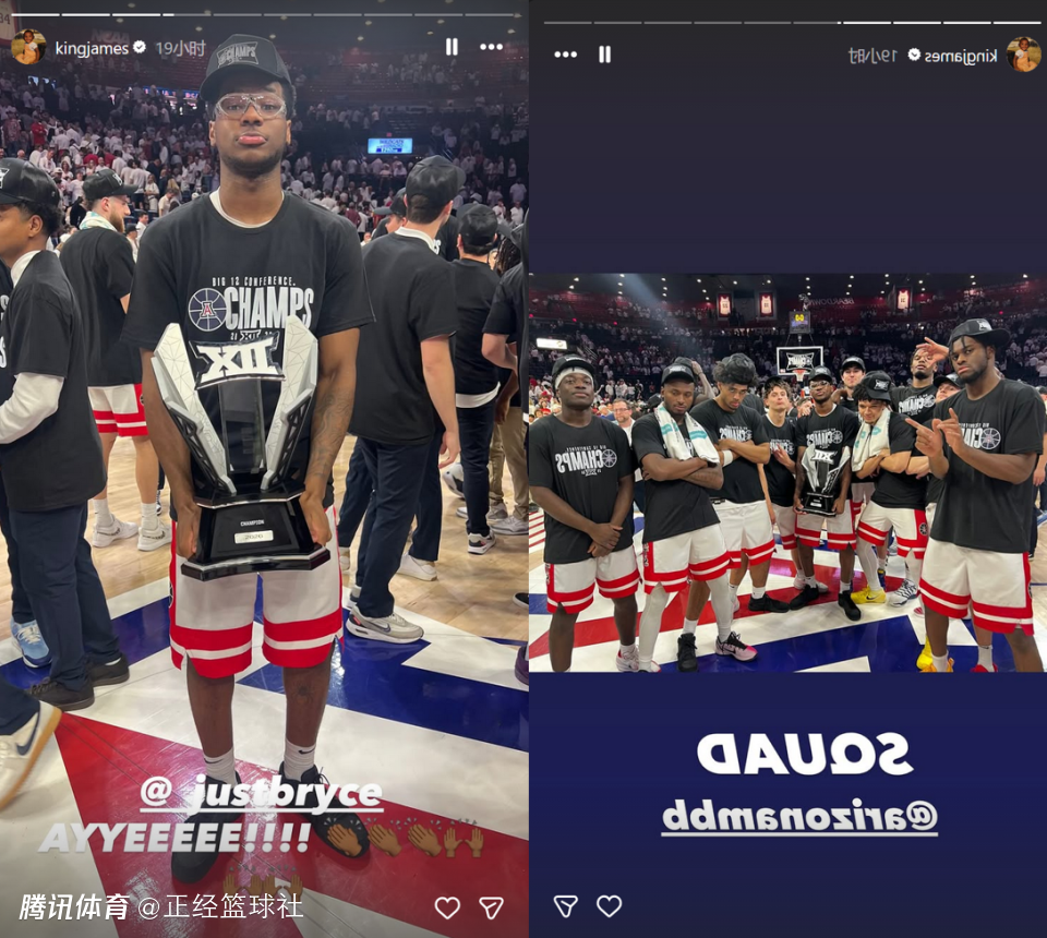 尽管没有登场贡献数据,布莱斯仍以团队一员身份收获大学生涯首个重要冠军。正因此,詹姆斯高调为二儿子庆祝,他转发了布莱斯夺得Big 12联赛常规赛冠军的捧杯照片。