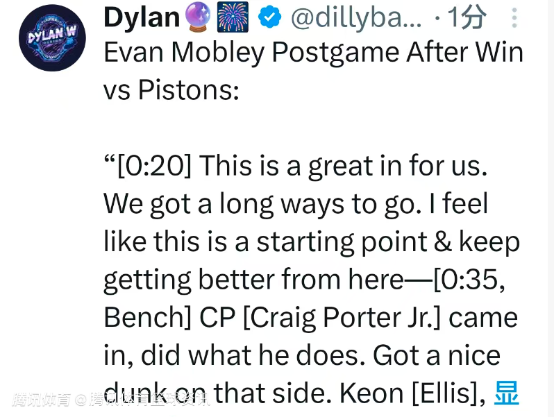 2026-03-04 11:10北京时间3月4日,NBA常规赛继续进行,骑士113-109战胜活塞。本场比赛中,骑士球星莫布利出战21分钟,得到18分5篮板4助攻2抢断。赛后,他接受媒体采访。