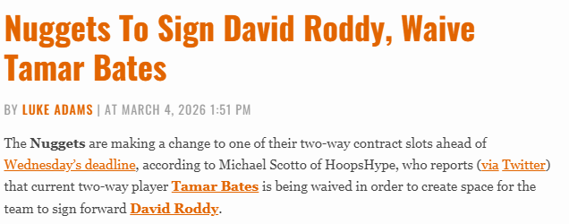2026-03-05 05:00北京时间3月5日,据记者Michael Scotto报道,掘金队将裁掉现双向合同球员塔马尔-贝茨,为签下大卫-罗迪腾出名额。