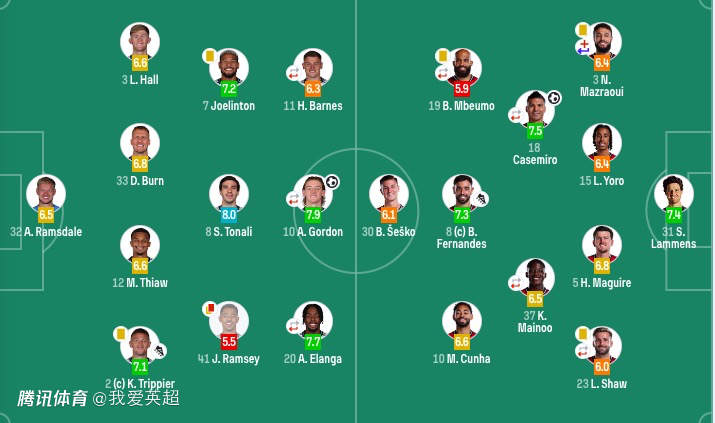 纽卡首发:32-拉姆斯代尔、2-特里皮尔、3-刘易斯·霍尔、12-佳夫、33-丹-伯恩、7-乔林顿、8-托纳利