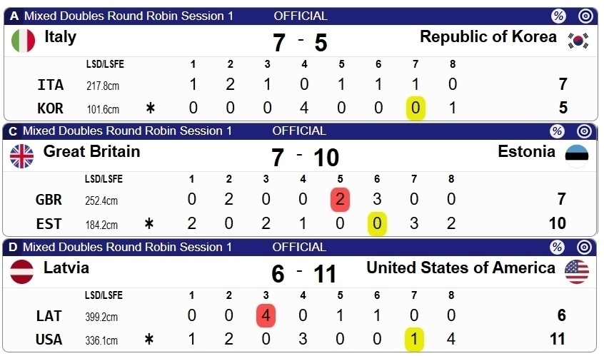 另外三场比拼里,意大利7-5韩国、英国7-10爱沙尼亚、拉脱维亚6-11美国。