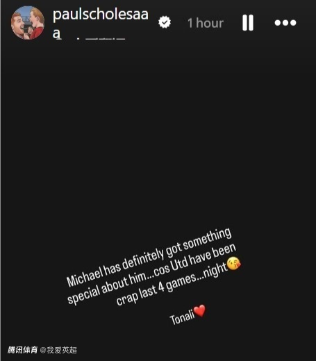 斯科尔斯写道:“迈克尔(卡里克)身上肯定有某种特别之处。因为曼联最近4场比赛表现简直烂透了,晚安,托纳利!”