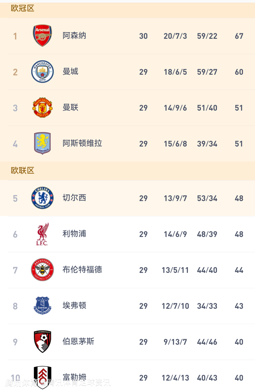 英超积分榜:阿森纳先赛7分领跑 曼城曼联位居二三 切尔西利物浦分列五六