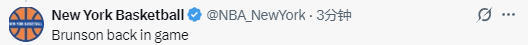 2026-03-05 10:00北京时间3月5日,NBA常规赛继续进行,尼克斯队对阵雷霆队。本场比赛进行到第三节,布伦森疑似腿部受伤,返回更衣室。在经过简单检查之后,布伦森已经重返赛场。