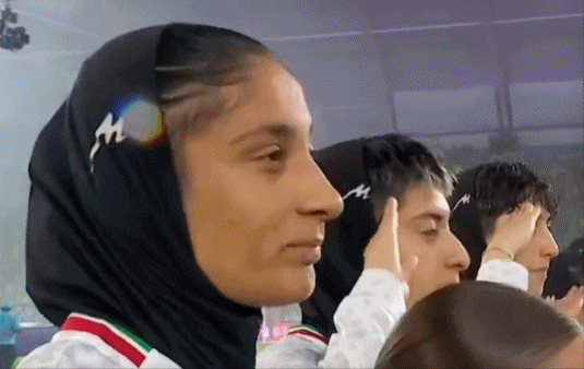 赛前的奏国歌仪式,首轮曾集体沉默的伊朗女足本场不仅高声跟唱,首发11位球员更是动情敬礼,似乎是在声援战争中的祖国。伊朗女足此举,也引发了现场观众的喝彩。