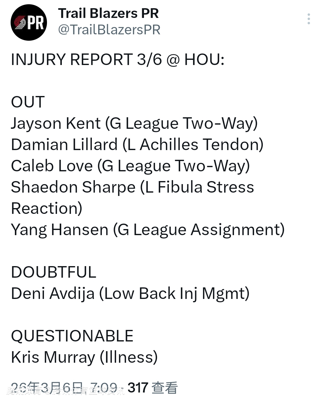 2026-03-06 07:30北京时间3月6日,开拓者队官方发布了明日对阵火箭队的伤病报告,其中杨瀚森因被下放至G联赛,将缺席本场比赛,具体情况如下: