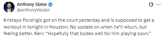 本场比赛开始前,波尔津吉斯与塞斯-库里参加了投篮训练,虽然科尔表示,波尔津吉斯目前还没有确定的复出时间表,但能参与训练。科尔说道:“波尔津吉斯感觉好转、能够随队出征,这是很好的信号,希望这预示着他很快就能上场比赛。”