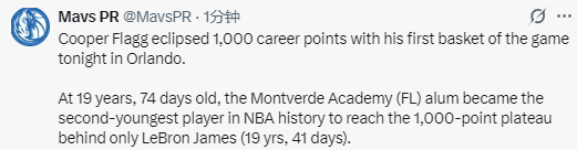 根据独行侠队官方发布的数据统计显示,弗拉格在19岁74天拿到了NBA生涯1000分,成为NBA历史上