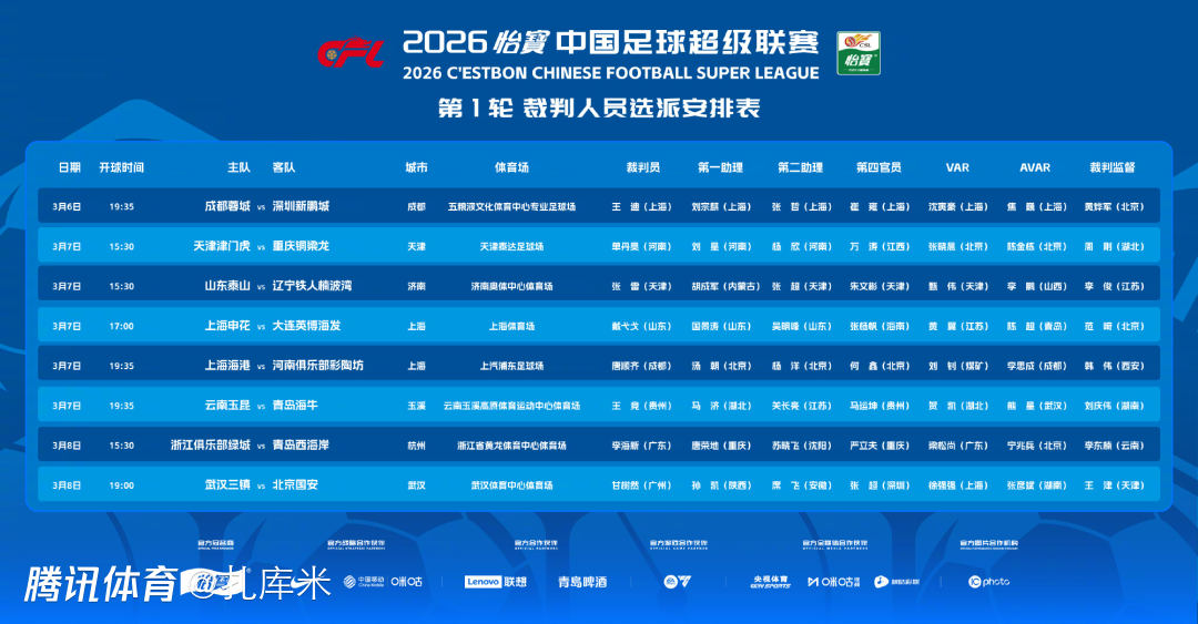 2026-03-06 10:20北京时间3月6日,中超新赛季首轮打响,赛前官方公布了本轮的执法裁判名单。王迪执法成都蓉城和深圳新鹏城的揭幕战,张雷执法山东泰山和辽宁铁人的比赛,戴弋戈主哨上海申花和大连英博,唐顺齐则执法上海海港和河南队的比赛。