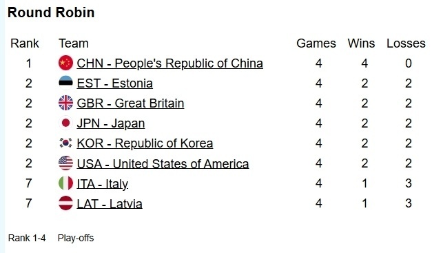 目前,中国四战全胜稳居第一的同时,也因为连胜导致包括爱沙尼亚、英国、日本、韩国、美国这5支队伍都是2胜2负...由于胜负场差距拉开,所以中国队要是能拿下第五场,提前晋级四强的可能越来越大。