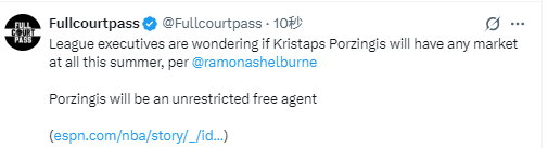 2026-03-06 22:40北京时间3月6日,据ESPN名记Ramona Shelburne报道,联盟高管们正在怀疑,波尔津吉斯今年夏天在自由市场上是否还会有任何球队愿意接手。波尔津吉斯今夏将成为完全自由球员。