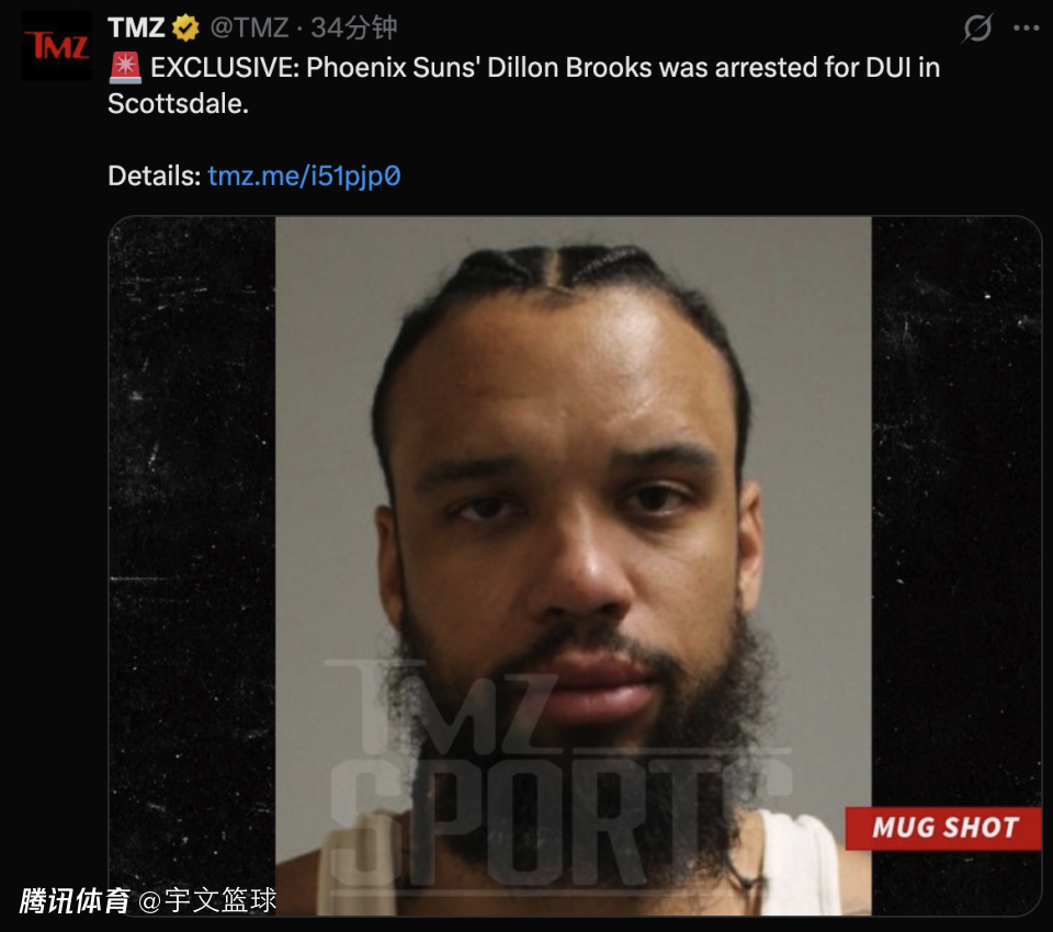 2026-03-07 00:00据八卦媒体TMZ报道,太阳球员狄龙-布鲁克斯在当地时间周五凌晨因酒后驾车被警方逮捕。据警方表示,这位太阳小前锋于凌晨2点左右在斯科茨代尔被捕,并于凌晨3点20分左右获释。据悉,狄龙在获释前表现得尊重警方并积极配合。