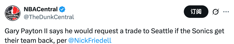 2026-03-07 00:10北京时间3月6日,据美记尼克-弗里德尔报道,小佩顿表示,如果西雅图超音速队能够重返NBA,他会主动申请被交易到西雅图。