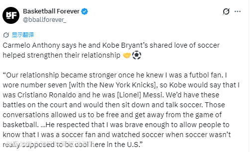 安东尼说道:“自从他知道我是足球迷之后,我们的关系就更近了。我在纽约尼克斯穿7号球衣,所以科比会说,我是C罗,他是梅西。我们在场上是对手,赛后会坐下来聊足球。这些聊天让我们能放松下来,暂时远离篮球……在美国,那时候足球还不算流行,他很尊重我敢于让大家知道我喜欢足球、看足球。”