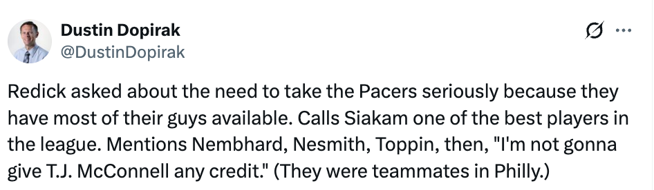 被问及是否需要严肃对待阵容基本齐整的步行者时,雷迪克表示了肯定,并称西亚卡姆是联盟顶级球员之一,还提到了内姆布哈德、内史密斯、托平这些主力,随后他打趣道:“我可不会给麦康奈尔任何夸奖。”