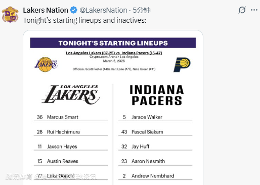 2026-03-07 11:30北京时间3月7日,NBA常规赛继续进行,湖人队对阵步行者队。赛前,双方公布了本场比赛的首发名单。詹姆斯和艾顿此役均因伤缺阵,雷迪克也调整了首发阵容。