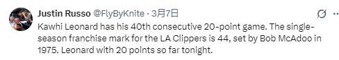 强势延续!莱昂纳德达成连续40场20+ 只差4场追平队史纪录