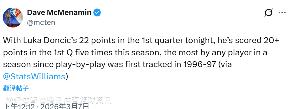 首节22分!东契奇本赛季已5次首节20+ 创96-97赛季以来最高