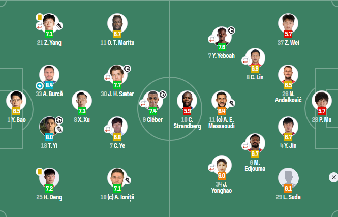 未出场替补:14-王星皓、24-余鉴贤、4-李松益、16-张祥硕、6-赵宇豪、15-张宇峰、34-卡约(F)、27-韩子龙、36-费尔南多