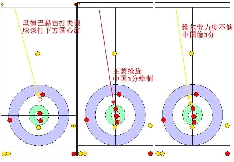 王蒙稳扎稳打3分牵制,里德巴赫旋壶失误,中国偷到3分。