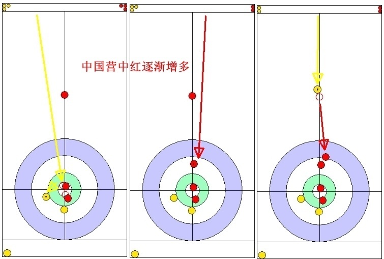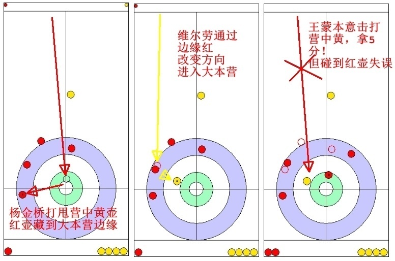 维尔劳第二投双飞差了点运气,将中国红壶推到占位后藏好;杨金桥第二投打定调整位置,第三投打甩成功也藏的不错。