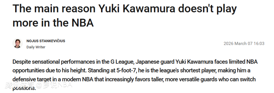 2026-03-08 05:00北京时间3月8日,欧洲篮球专家Stankevicius撰文提及河村勇辉,他表示,尽管在G联赛(发展联盟)打出了轰动性的表现,这位日本后卫在NBA仍面临有限的出场机会,根源还是在于他的身高。