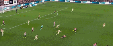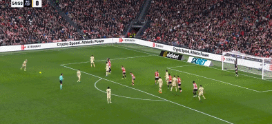 55分钟,奥尔莫任意球兜射击中人墙。