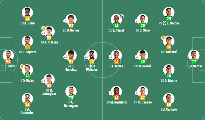 巴塞罗那:霍安-加西亚;埃里克-加西亚,库巴西,赫拉德-马丁,坎塞洛;奥尔莫(62'费尔明),贝尔纳尔(46'佩德里),卡萨多;亚马尔,费兰-托雷斯(62'莱万多夫斯基),拉什福德(62'拉菲尼亚)
