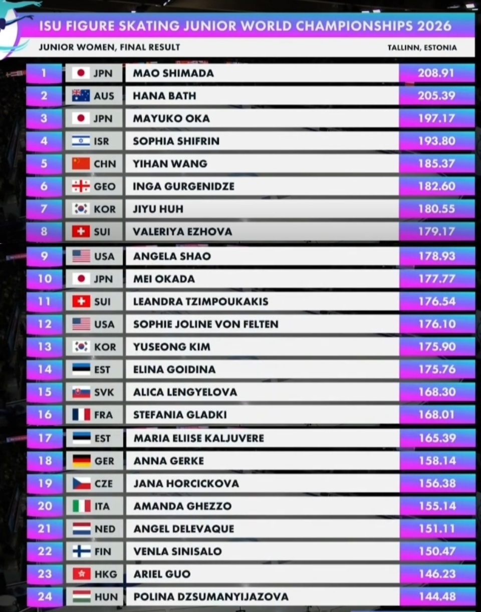 短节目里,岛田麻央以71.90技压群芳,冈万佑子以69.77紧随其后。澳大利亚选手巴斯、以色列希费林、格鲁吉亚古尔格尼德泽排在3-5位。
