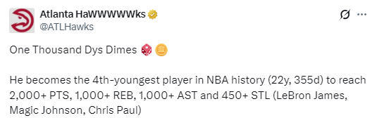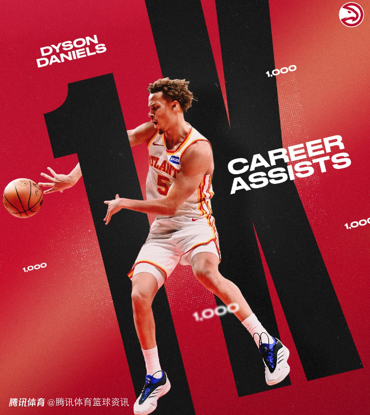 2026-03-08 07:40北京时间3月8日,NBA常规赛继续进行,老鹰队对阵76人队。本场比赛,老鹰队球员丹尼尔斯迎来里程碑,完成生涯第1000次助攻。他也成为NBA历史上第4年轻达成2000+得分、1000+篮板、1000+助攻、450+抢断的球员(22岁355天),仅次于勒布朗-詹姆斯、“魔术师”约翰逊和克里斯-保罗。
