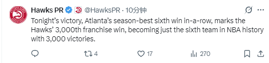 2026-03-08 10:10北京时间3月8日,NBA常规赛继续进行,老鹰队125-116击败76人队。在赢下这场比赛之后,老鹰队常规赛历史总胜场达到3000胜,成为了NBA历史上第6支做到这点的球队,另外5支达到常规赛3000+胜场的球队分别是凯尔特人队、湖人队、76人队、尼克斯队和勇士队。
