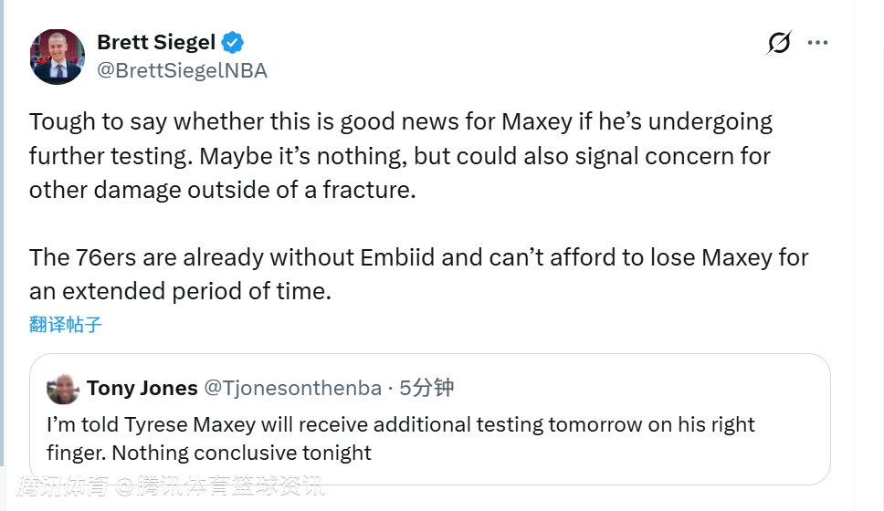 名记Brett siegel随后跟进报道表示,目前尚无法确定马克西接受进一步检查对他来说是否是好消息。也许情况并不严重,但这也可能意味着,除骨折外,医生还在排查是否存在其他损伤。76人已经缺少了恩比德,他们承受不起马克西长期缺阵。