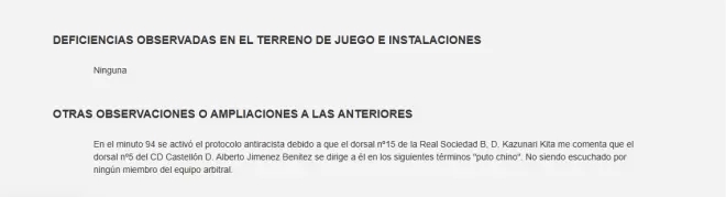 在赛后的裁判报告中也记录了这一情况。报告写道,在第94分钟启动了反种族主义程序,因为皇家社会B队15号球员喜多壱也向裁判投诉称,卡斯迪隆5号球员希门尼斯使用“该死的中国佬”这一称呼对其进行辱骂。不过裁判组其他成员表示,并未听到相关言语。