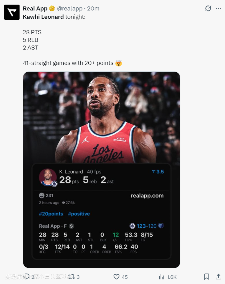 这场比赛科怀-伦纳德延续了个人的纪录:1.连续41场比赛拿到20+生涯新高;