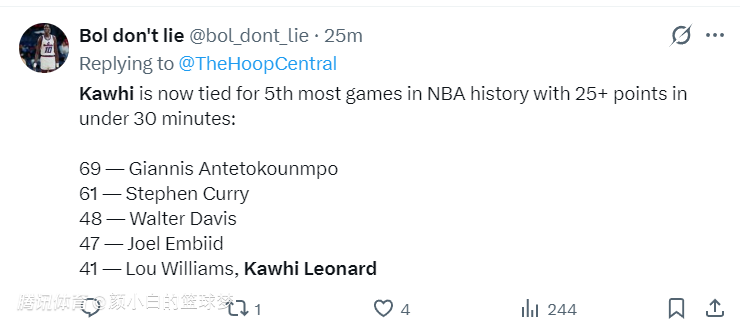 4.在不到30分钟时间里拿到25+的场次伦纳德已经41次与路威并列历史第五,第一是字母哥69次。