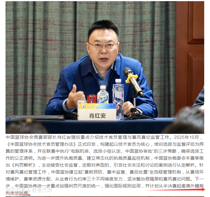 2026-03-08 21:30中国篮协竞赛部部长肖红安在会议上透露,中国篮协将进一步重点加强判罚尺度的统一,强化国际规则应用,并计划从半决赛起邀请外籍裁判来华执裁。