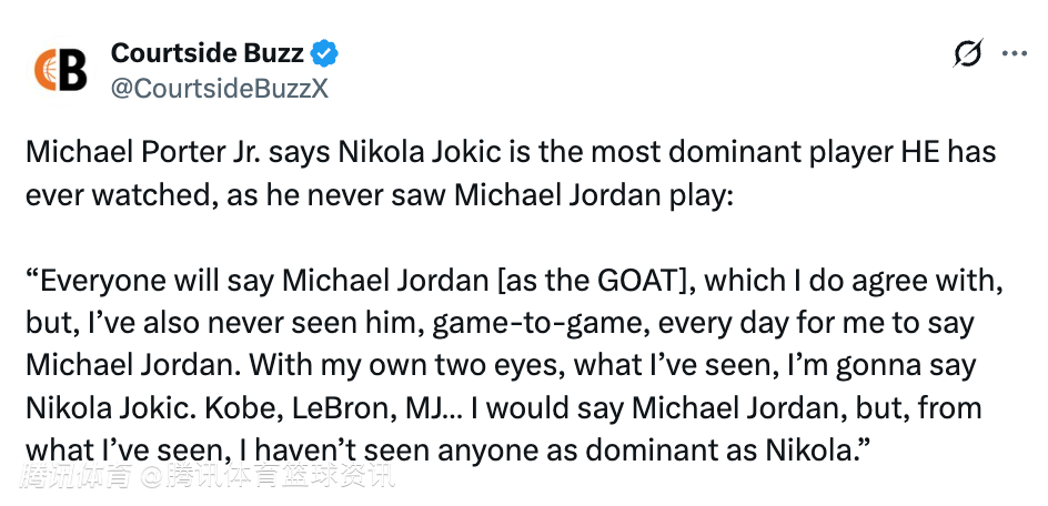 小波特表示:“大家都会说乔丹是 GOAT,这点我也认同。但我从没一场不落地看过他打球,没法凭亲身经历去说他是最佳。就我亲眼所见、亲身经历的而言,我会选约基奇。科比、勒布朗、乔丹,从历史地位来说我认可乔丹,但就我亲眼看过的表现里,没人比约基奇更具统治力。”