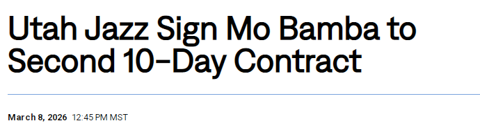在第二份10天短合同期间,班巴还可以为爵士出战4场比赛,合同将于3月18日到期。届时爵士必须选择将他签约至赛季结束,或让他恢复自由身。