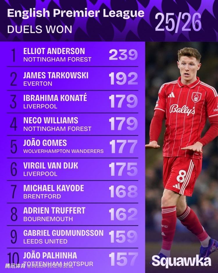 2026-03-09 07:10北京时间3月9日,数据机构Squawka统计了本赛季英超球员在对抗中的成功次数,并公布了相关排名。其中,诺丁汉森林中场埃利奥特·安德森以239次高居榜首,同时也是目前唯一一位对抗成功次数突破200次的球员。