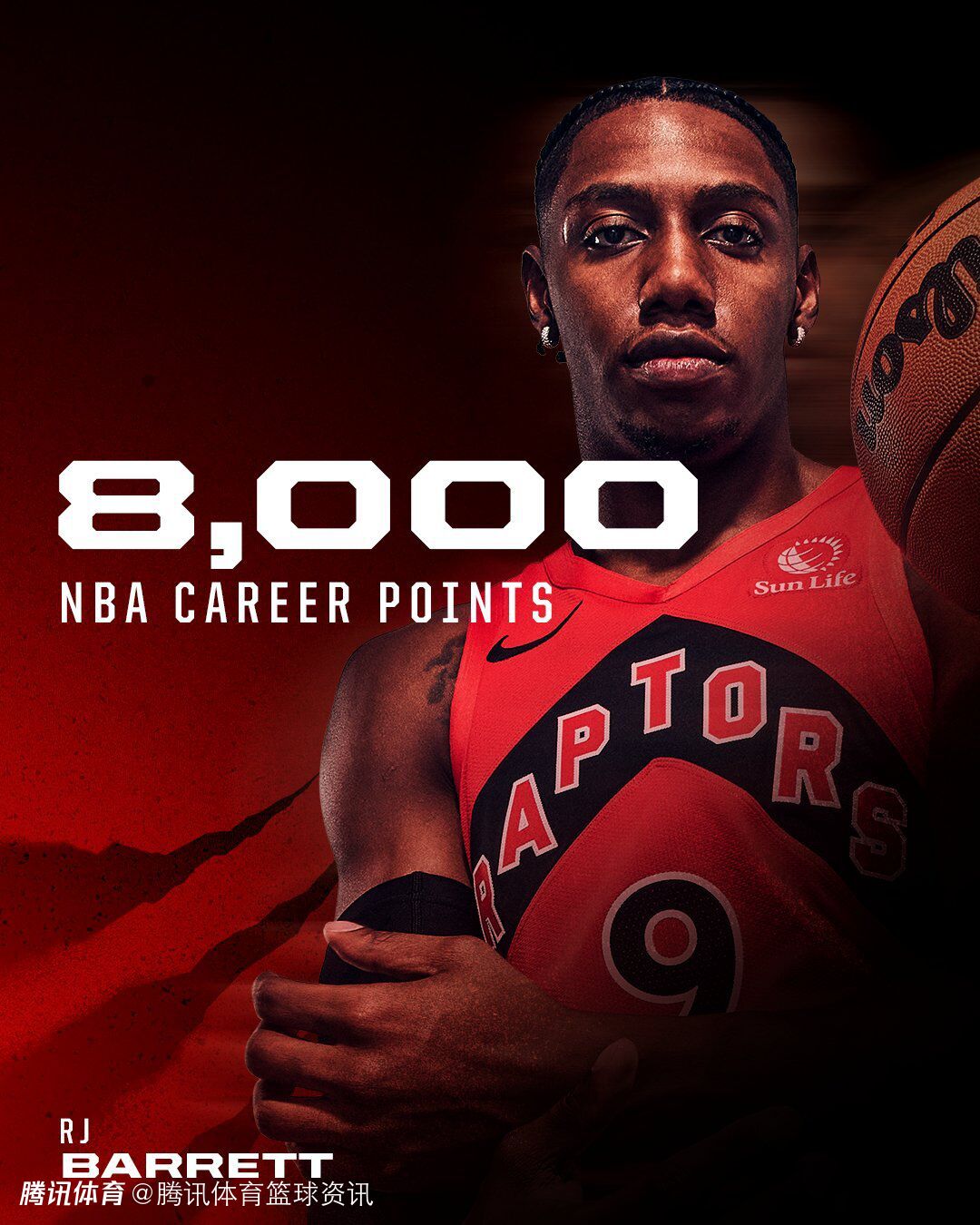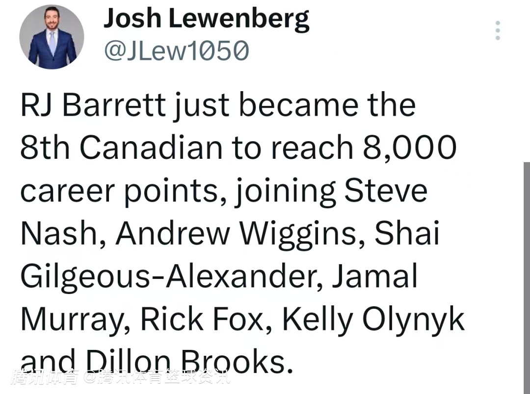 比赛中,猛龙球员巴雷特上半场轰下16分,在得到第13分时,职业生涯总得分正式突破8000分,成为历史第8位达成这一成就的加拿大籍球员。跻身纳什、维金斯、亚历山大、贾马尔-穆雷、里克-福克斯、奥利尼克和狄龙-布鲁克斯的行列。