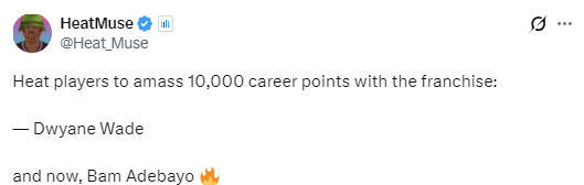 在第三节比赛开始后不久,阿德巴约三分远投命中,让自己完成了里程碑。根据数据统计显示,热火队历史上只有2名球员队史总得分达到10000分,除了阿德巴约之外,另外一名球员是热火传奇韦德。
