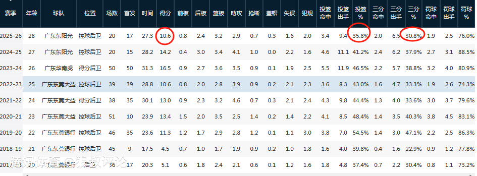 这一份成绩是胡明轩三连冠之后状态最差一个赛季,也是过去7年得分(追平),投篮命中率的新低。