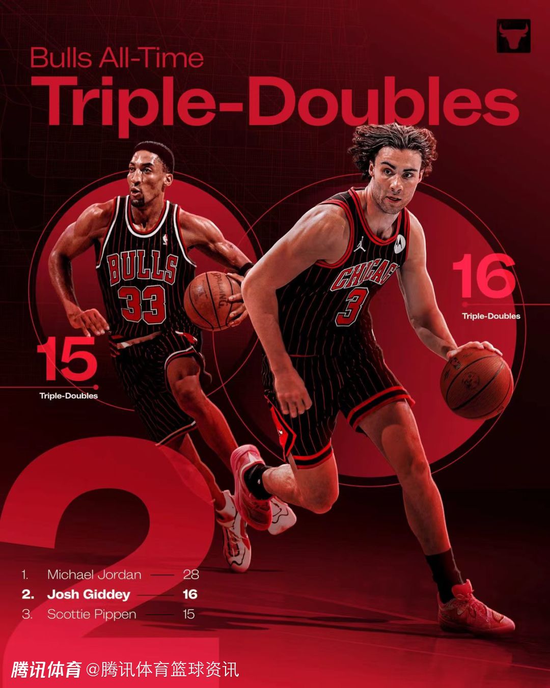 凭借这次三双,吉迪以16次三双超越名宿斯科蒂-皮蓬(15次),升至公牛队史三双榜第二位,仅次于排名榜首的传奇球星迈克尔-乔丹(28次)。